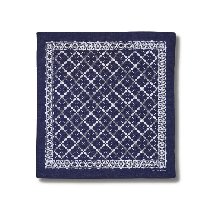 The history of Post O'Alls bandanas dates back to the brand's earliest days in 1993, and for the first few seasons all products were sold with original designs. After that, from the late 1990s, we released a large-sized, discharge-printed vintage type series, and from 2016FW, we changed the production background and developed it with new partitions. The characteristics of the newer ones are that they are smaller than the previous ones (45cm x 45cm) and that the cutout parts are bleached white instead of natural. The reason for this is that a handkerchief-sized one fits better when inserted into a jacket's breast pocket, and a white one looks cleaner on the face than a natural one. Because of the process of bleaching and printing, we ask Kamawanu, a renowned tenugui manufacturer, to produce our products. This time's partitions are based on the designer's favorite vintage patterns, and are reproduced as they are, respecting the originals.